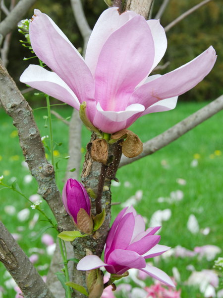–Spring Gallery 2013 Beautiful daffodils, here today, and gone too quickly… Magnolia tree in bloom. Bearded iris Self seeded cilantro coming up in the circle. Chives in full bloom. Pea shoots beginning to climb the trellis